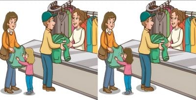 Klaar voor de volgende uitdaging? Bekijk twee foto’s van een kledingwinkel waar een gezin kleding koopt. Op het eerste gezicht lijken de foto’s hetzelfde, maar kijk goed. Er zijn drie kleine verschillen. Denk je dat je ze allemaal kunt vinden in slechts 25 seconden? Laat maar eens zien hoe scherp je bent!
