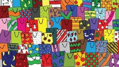 Er staan veel felgekleurde pakjes op de foto. Er zit één cadeaubon tussen. Start de timer en kijk goed naar de afbeelding. Als je dit in 18 seconden kunt, behoor je tot de 1% oplettendsten!