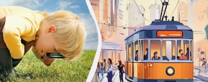 De afbeelding toont een drukke straat waar mensen langs lopen en een gewone tram rijdt. Je moet een timer instellen voor vijf seconden en erin slagen de fout te vinden voordat de tijd om is. Klaar?