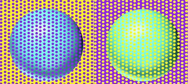 De ballen lijken verschillend omdat de linker bal omgeven is door paarse stippen op een gele achtergrond en de rechter bal omgeven is door gele stippen op een paarse achtergrond.