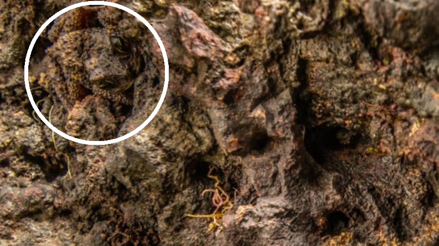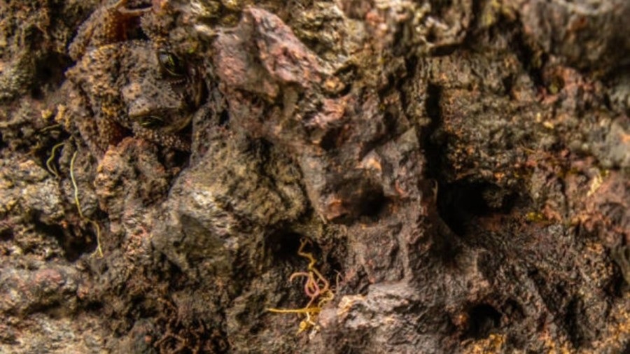 Op het eerste gezicht lijkt het alsof er niets anders op de foto staat dan het oppervlak van de steen. Maar dat is niet zo. Er schuilt ergens een kikker, die heel goed gecamoufleerd is. Alleen goed oplettende mensen kunnen hem zien.