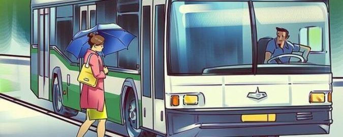 In de afbeelding zien we een vrouw in een bus stappen. Het is regenachtig weer buiten, dus ze houdt een paraplu vast om zich tegen de neerslag te beschermen.