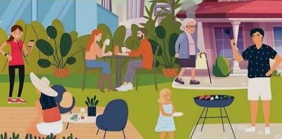 Kijk eens naar de afbeelding hieronder. Het toont een openluchtfeest. De mensen op de foto zijn aan het ontspannen, kletsen en barbecueën.