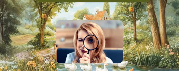 Hieronder zie je een afbeelding van een huis, bomen en een vijver. Het lijkt een prachtige sfeer, een interessant idee van landschapsontwerp. Maar iets op deze afbeelding is niet zo. En het is jouw taak om vast te stellen wat dat is.