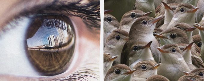 Op de puzzel moet je een mus vinden tussen de nachtegalen / collage met foto’s van pixabay.com en Moje