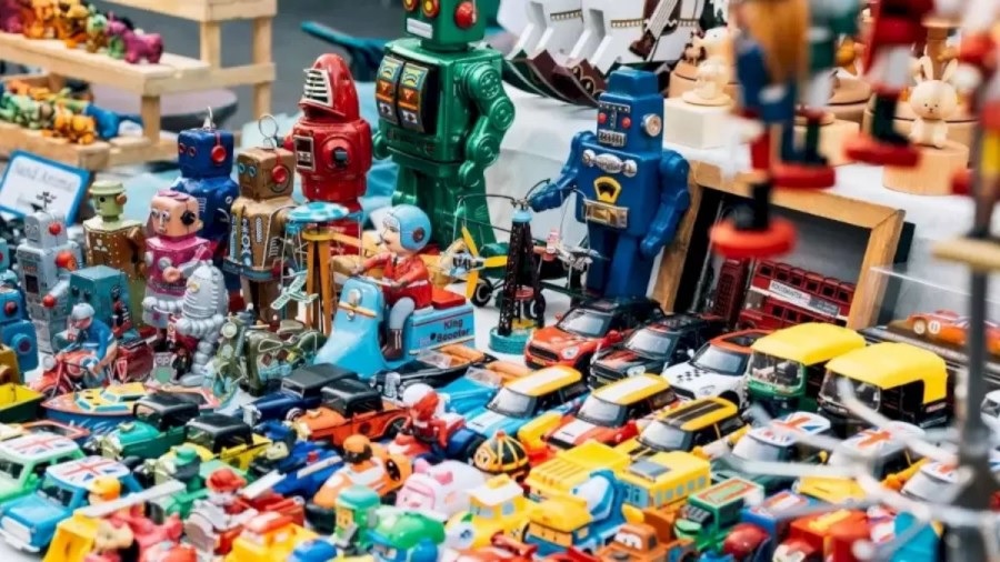 Op de foto zien we een groot aantal verschillende soorten speelgoed – robots, boten, auto’s en dergelijke. Het speelgoed staat heel zorgvuldig en vakkundig in rijen, dicht op elkaar – het lijkt erop dat er geen plek is voor een naald om te vallen.