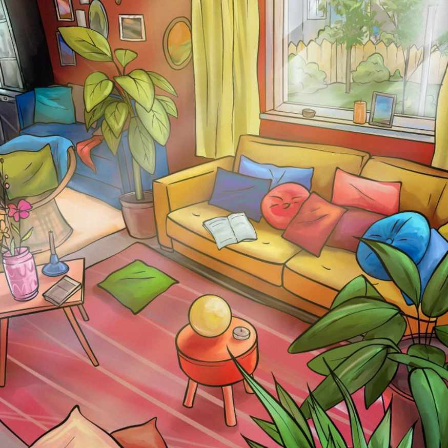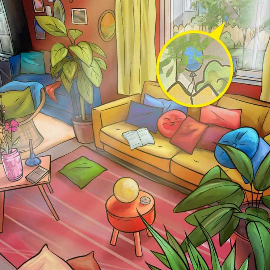 In de afbeelding hierboven zie je de binnenkant van de woonkamer. Er staat een bank, planten in potten, tafels en een paar kussens in verschillende vormen voor een groot raam met uitzicht op de tuin. Ergens in deze afbeelding is een ballon verstopt. Kun jij hem vinden? In dit puzzelspel moet je de ballon binnen een bepaalde tijd vinden.