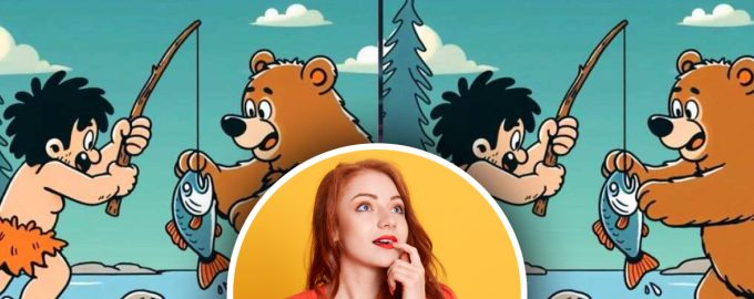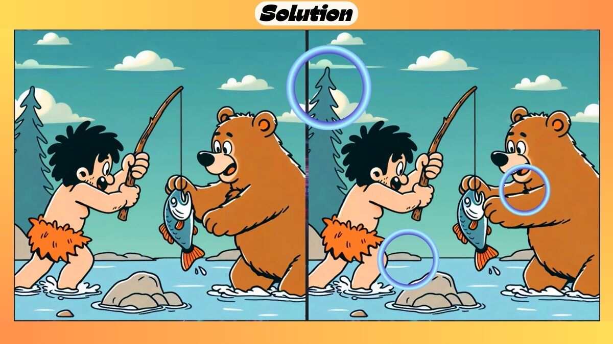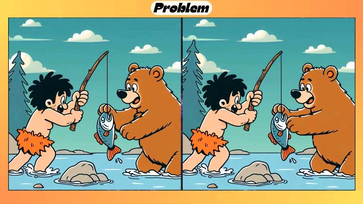 In het volgende raadsel moet je drie verschillen vinden tussen de afbeeldingen van een man en een beer die aan het vissen zijn schrijft jagranjosh.