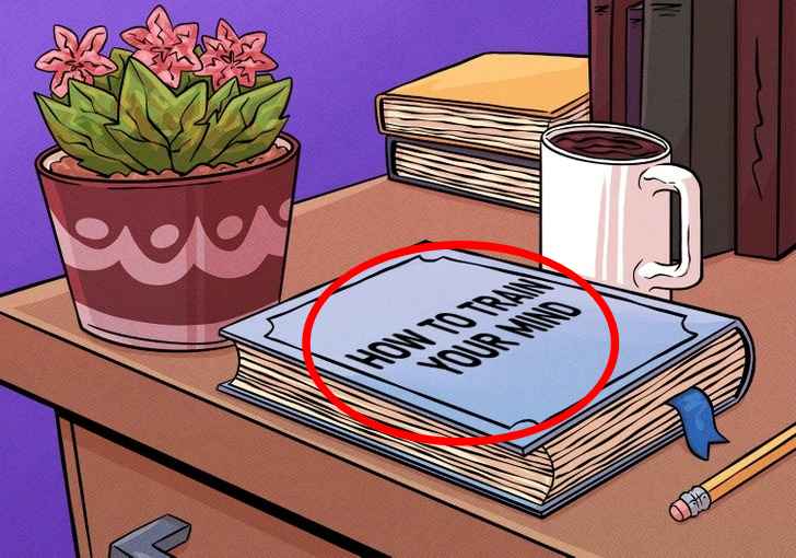 Op de foto zien we verschillende voorwerpen die op tafel staan – een bloem in een pot, verschillende boeken, een kopje koffie en een potlood. Op het eerste gezicht lijkt het alsof alles op de foto klopt en niets verdacht is. Maar niet alles is zo eenvoudig. Ergens in de afbeelding zit een fout die je moet vinden.