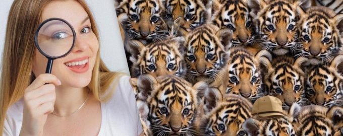 Op de afbeelding zie je een heleboel tijgers, maar naast hen is er nog iemand. Drie kleine kittens hebben zich handig verstopt tussen de roofdieren en het zal heel moeilijk worden om ze te vinden. Als het je lukt om de opdracht uit te voeren en de toegewezen tijd – 12 seconden – te halen, kun je trots zijn op je oplettendheid en arendsogen.