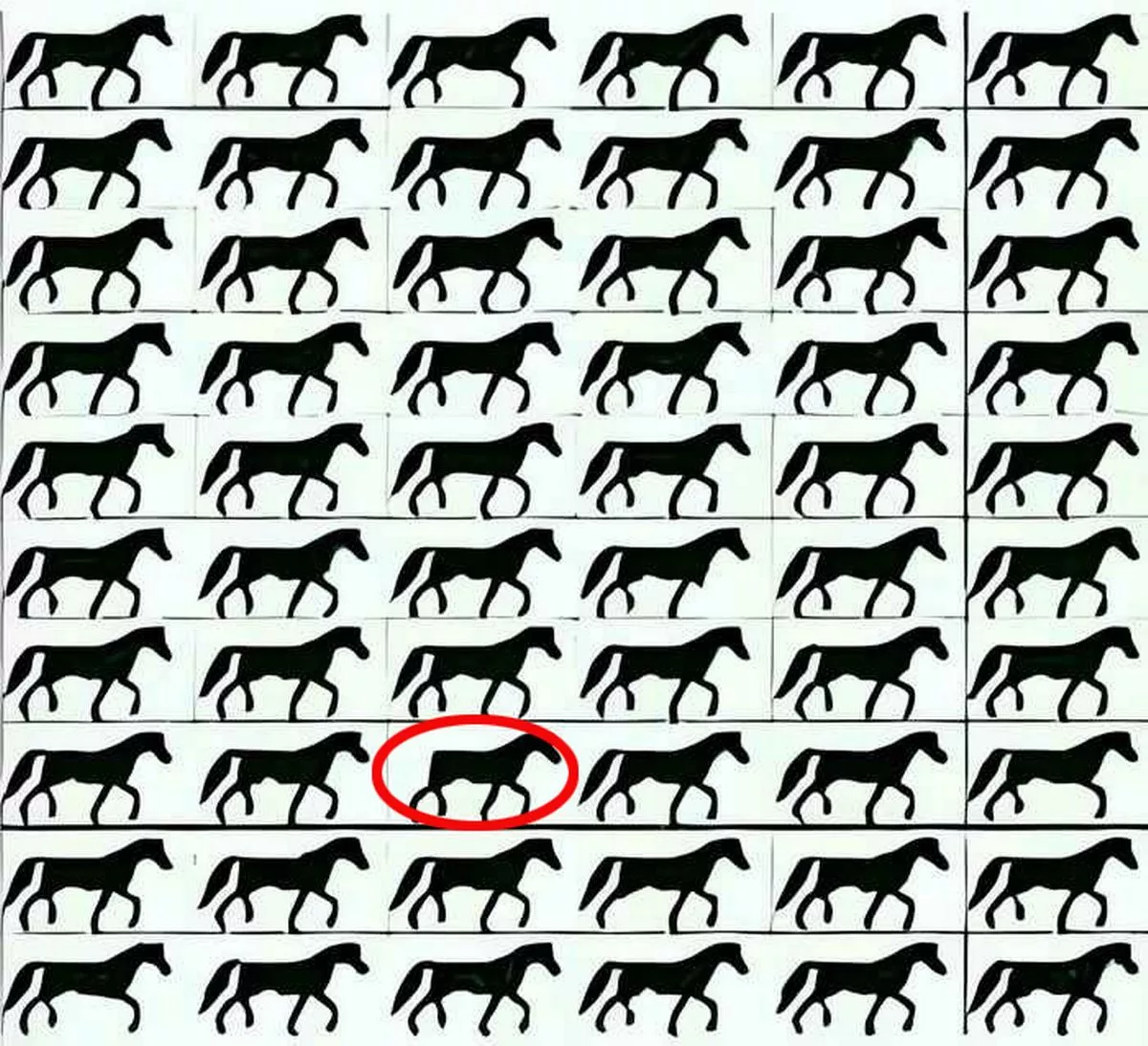 Je moet een paard zonder staart vinden. Op het eerste gezicht lijkt de afbeelding misschien moeilijk op te lossen. Er staan zoveel paarden in de afbeelding dat je ogen verstrooid raken.