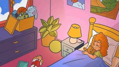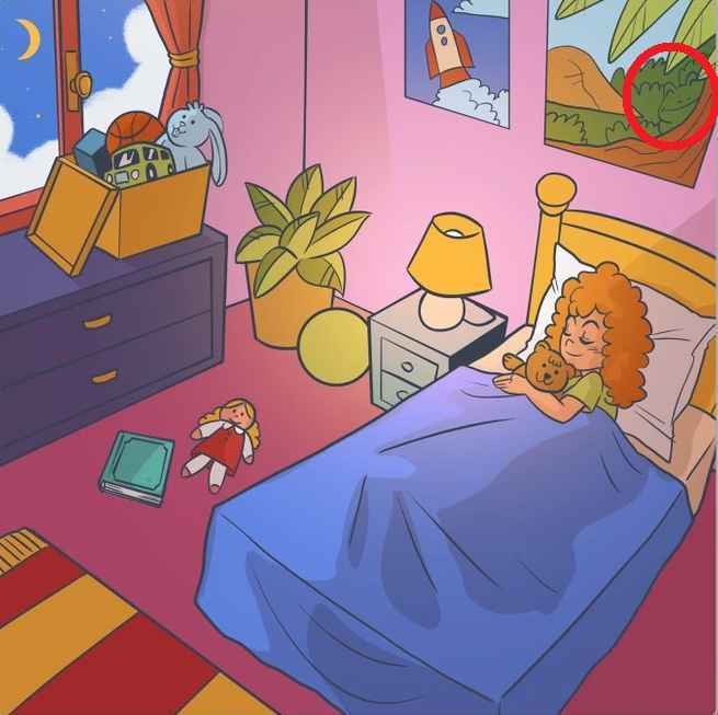 Los een uitdagende puzzel op die je aan het denken zet – in de kamer waar het meisje slaapt, moet je de groene kikker vinden die op de loer ligt.