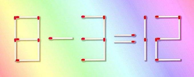 Zoals je kunt zien, moet de lucifer linksonder van het getal 8 naar de min worden verplaatst, zodat het een plus wordt. En dan krijgen we de juiste gelijkheid: 9 + 3 = 12.