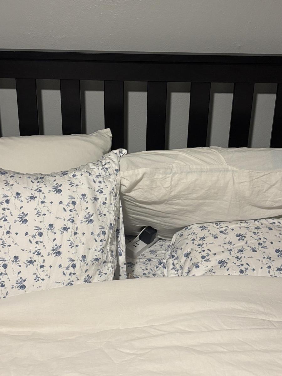 Op de foto zien we een deel van het bed. Op het eerste gezicht lijkt het alsof er geen levend wezen op de foto staat, maar in feite is dat niet zo – er verstopt zich daar ergens een poesje.