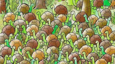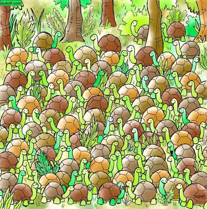 Er zijn veel schildpadden op de afbeelding hieronder, maar ergens daartussen zit een slang die handig vermomd is. Aan jou de taak om hem in slechts 5 seconden te vinden. Lukt het jou om de slang te vinden voordat de tijd om is? De tijd is om.
