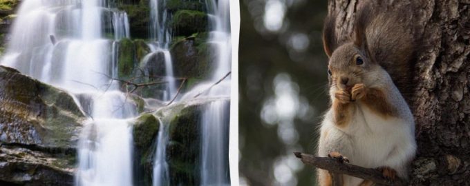 Eekhoorn “verstopt” in struiken bij waterval / collage Moje