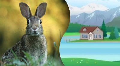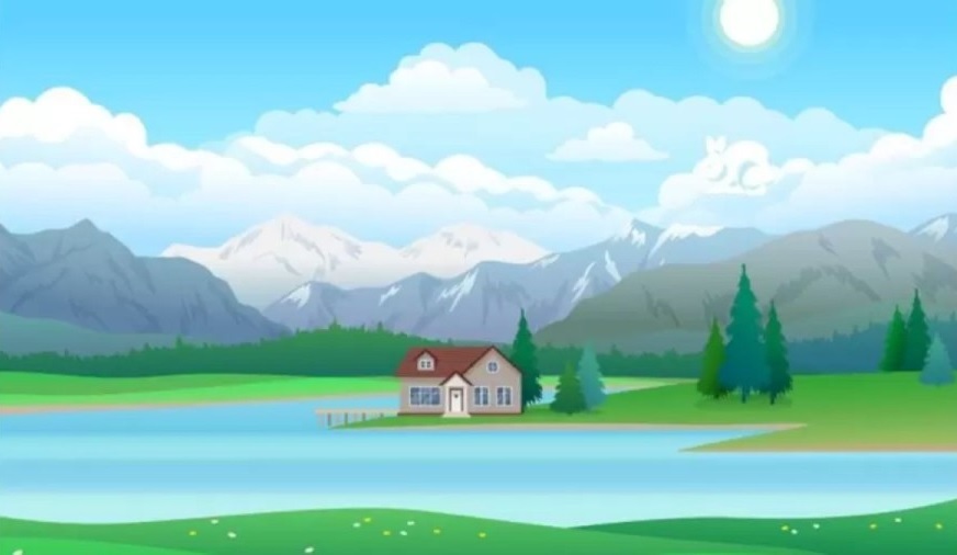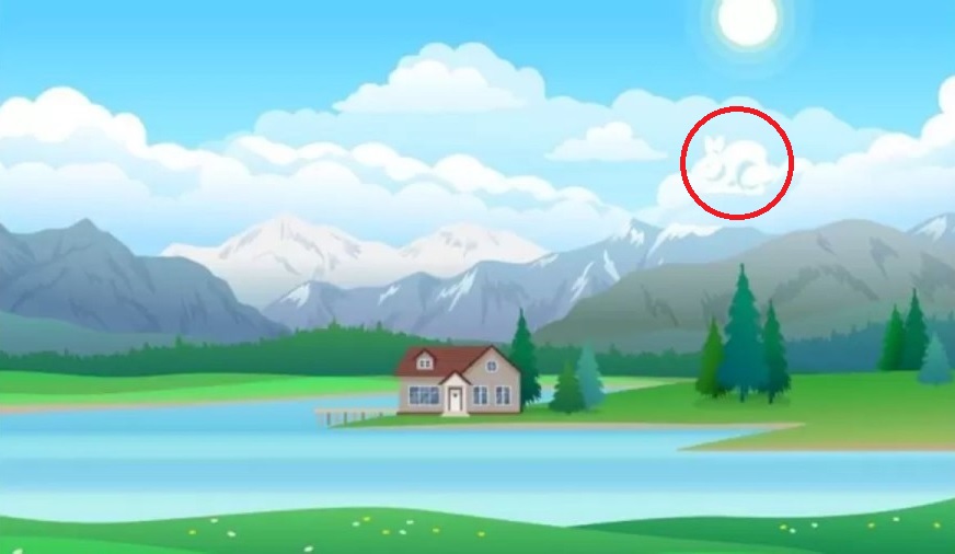 In de afbeelding zien we een huis bij het meer, en iets verder achter het huis – de bergen. We zien ook de lucht en wolken, een klein aantal bomen en gras. Maar ergens in deze natuur zit een verborgen dier – een konijn, dat heel moeilijk te vinden zal zijn.