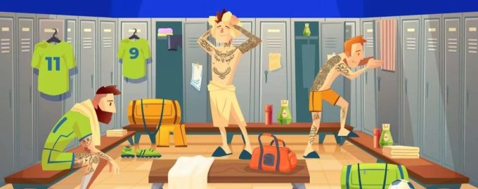 Kijk nu naar de afbeelding hierboven. Je ziet drie mensen in de kleedkamer. Het lijkt alsof ze net klaar zijn met een voetbalwedstrijd. Een van de mannen op de foto heeft zijn tenue nog aan, de tweede is zich aan het omkleden en de derde is net uit de douche gestapt en heeft zich in een handdoek gewikkeld.