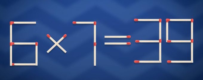 Voor je ligt een onjuiste gelijkheid 6 x 7 = 39, die bestaat uit 24 lucifers. Je moet twee extra lucifers vinden. Als je die weggooit, wordt de gelijkheid juist.