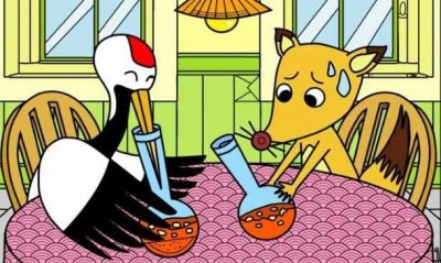 In de afbeelding zien we een scène uit het beroemde verhaal van de vos en de kraanvogel. Terwijl de kraanvogel vrolijk voedsel uit een smalle kolf eet, kijkt de vos alleen maar jaloers in de koker waaruit hij het smakelijke voedsel niet kan halen.