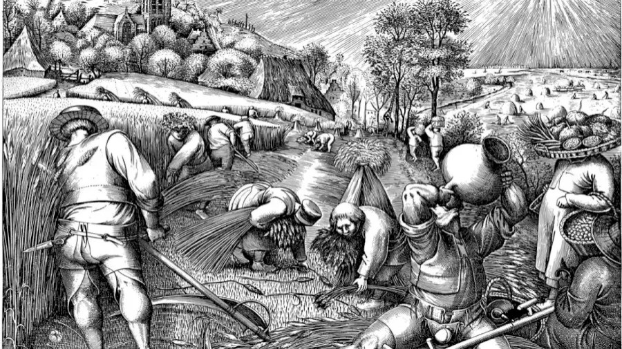 In de afbeelding zien we mensen rijp graan verzamelen in een veld. De mannen maaien de aren en de vrouwen verzamelen ze en kneden ze tot schoven. De zwart-wit foto vertelt een verhaal dat het harde werk laat zien van boeren die hun rijpe oogst verzamelen.