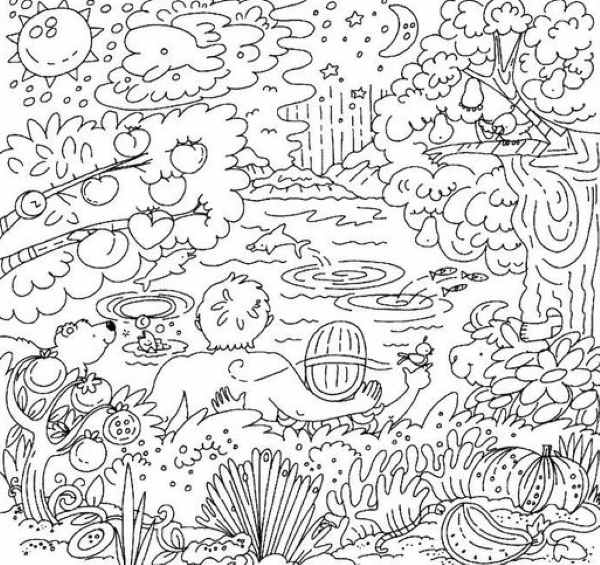 We zien een zwart-wit afbeelding met een mysterieuze plot: een man en een vrouw kijken naar een waterlichaam waar vissen zwemmen en fruitbomen omheen groeien. Het is niet gemakkelijk om de ring te vinden tussen zoveel kleine details.