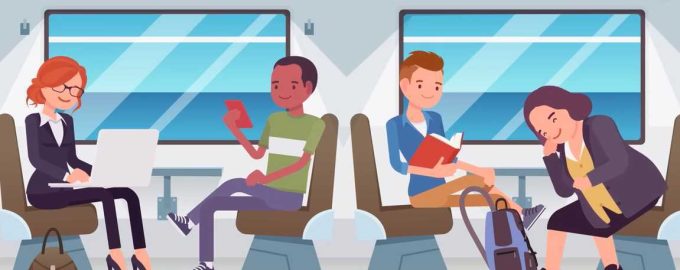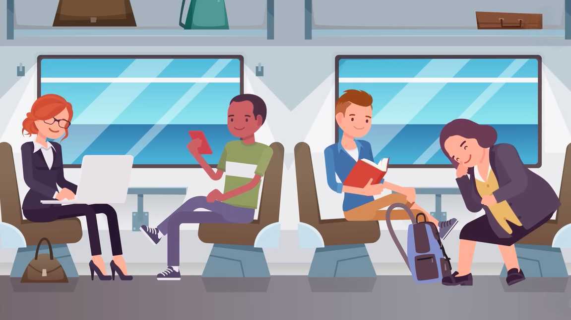 De afbeelding toont vier mensen in een trein, die elk iets anders doen.