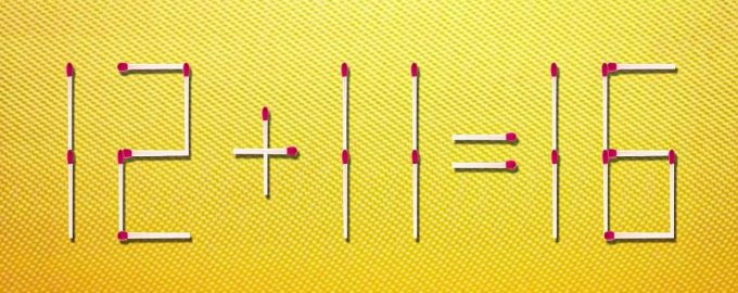 De afbeelding toont een onjuiste wiskundige gelijkheid 12 + 11 = 16. Het bestaat uit 23 lucifers. Eén ervan is op de verkeerde plaats geplaatst. Als je die naar een andere plaats verplaatst, wordt de gelijkheid juist. Jouw taak is om te raden welke lucifer je moet verplaatsen.