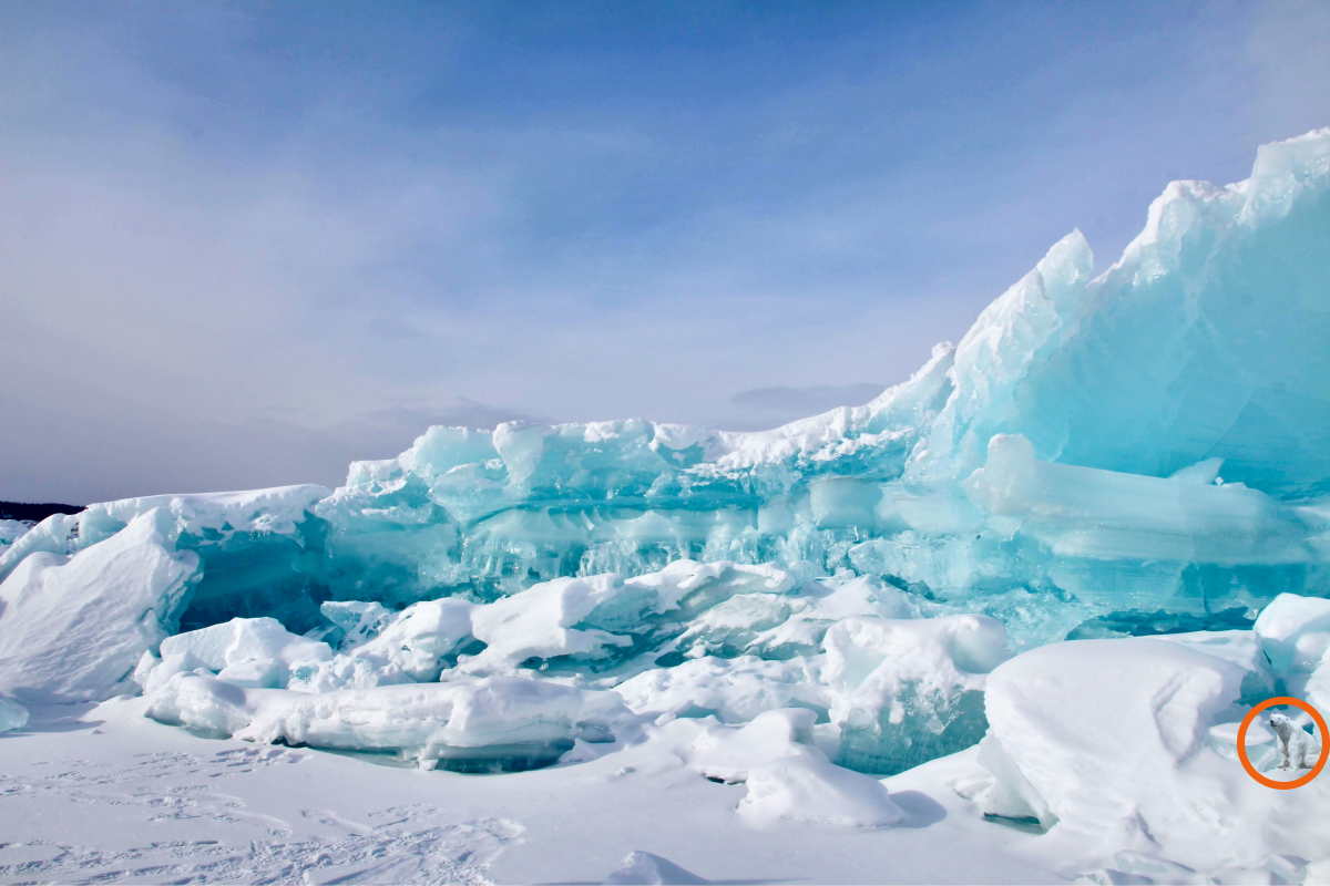 IJsberen hebben een witgekleurde vacht, dus het zal moeilijk zijn om ze te zien tussen de sneeuwwitte gletsjers.