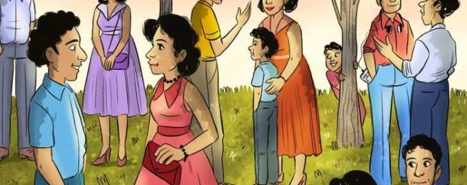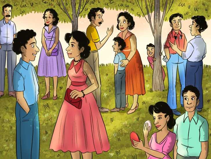 Het juiste antwoord is: de man in het rode shirt en de blauwe broek komt uit de toekomst, omdat hij een platenspeler bij zich heeft die voor de jaren tachtig nog niet verkrijgbaar was. En, te oordelen naar de kleding van de andere mensen, laat de tekening een oudere tijd zien.