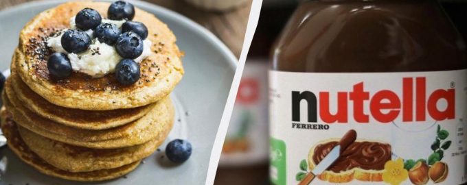 Je kunt de pannenkoeken nog lekkerder maken door een verborgen laag chocolade-hazelnootpasta toe te voegen.