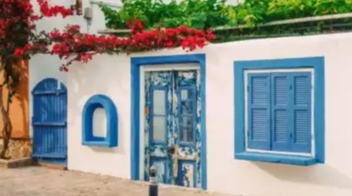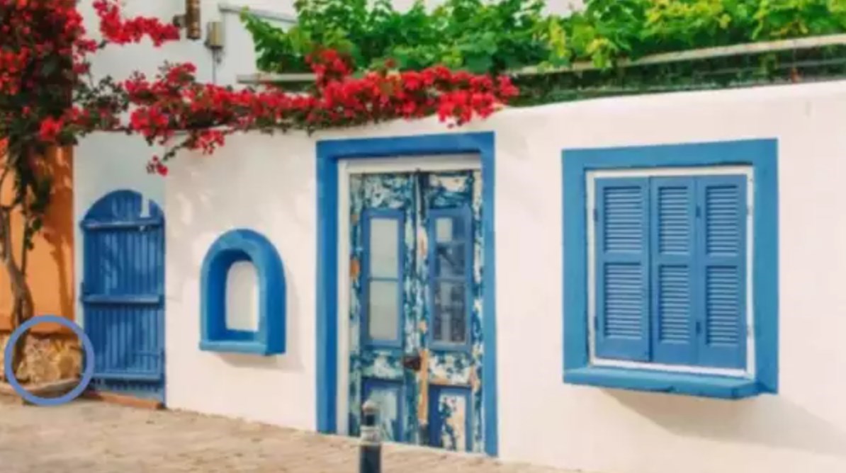 De afbeelding toont een huis in Griekenland met een kat ernaast. Jouw taak is om het dier binnen 10 seconden te vinden.