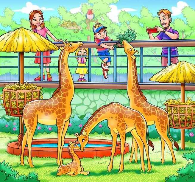 De foto is van een gezin in de dierentuin. De man filmt de giraffen met zijn telefoon en de kinderen en zijn vrouw kijken naar de dieren. Er zit ergens een aap verstopt, die je moet vinden.