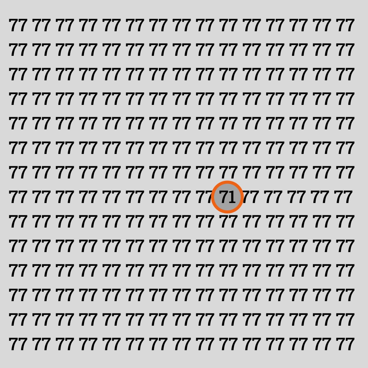In het volgende raadsel moet je tussen de vele getallen 77 het getal 71 vinden. Op het eerste gezicht lijkt het misschien makkelijk, maar trek niet te snel conclusies. Het raadsel is niet zo eenvoudig als het op het eerste gezicht lijkt.