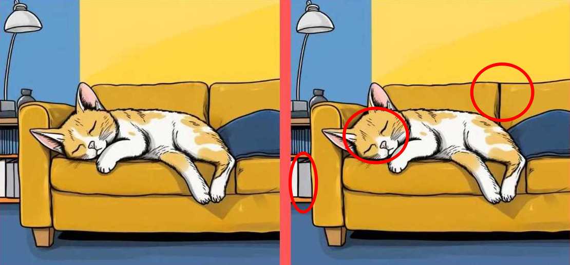 In het volgende raadsel moet je drie verschillen vinden tussen de afbeeldingen van een kat die op de bank slaapt, schrijft jagranjosh.
